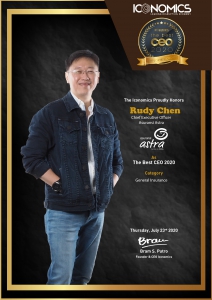Jakarta; CEO Asuransi Astra, Rudy Chen dinobatkan meniadi Best CEO in General Insurance Category pada penghargaan BEST CEO – Employee’s Choice Award 2020. Penghargaan ini diberikan oleh Iconomics kepada CEO terbaik dari berbagai kategori industri, penghargaan ini diterima pada hari Kamis (23/7) dengan konsep virtual awarding dan webinar yang disiarkan di ICONOMICS TV, Zoom dan YouTube live streaming.