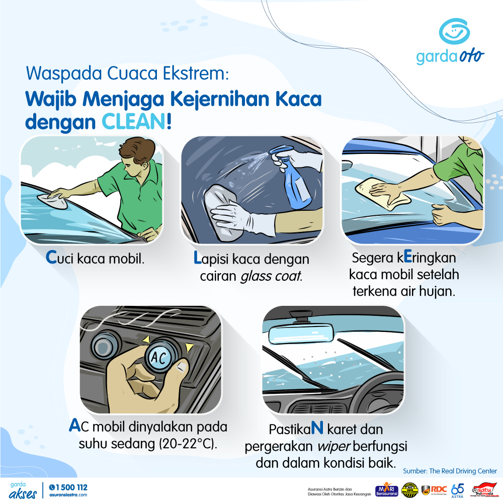 Salah satu cara meningkatkan visibilitas pengemudi saat cuaca esktrem adalah menjaga kejernihan seluruh kaca mobil. Simak tips CLEAN berikut untuk tetap #peaceofmind dalam berkendara! Cuci kaca dengan air dan sabun cuci mobil, lalu lap menggunakan kain microfiber dengan gerakan searah. Lapisi kaca dengan cairan glass coat (pelapis kaca anti air) untuk memberikan efek daun talas pada kaca. Efek daun talas ini membuat air tidak menempel pada permukaan kaca mobil. Segera kEringkan kaca mobil setelah terkena air hujan untuk mencegah timbulnya jamur kaca. AC mobil dinyalakan pada suhu sedang (20-22°C) untuk menyamakan suhu udara di dalam maupun luar kendaraan agar [...]