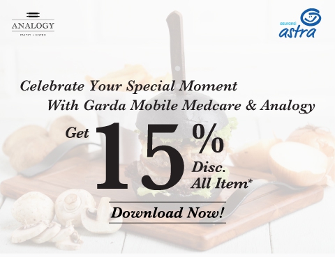Install Garda Mobile Otocare dan Medcare, dapatkan voucher discount 15% untuk semua jenis makanan dan minuman di seluruh store Analogy Pastry and Bistro.